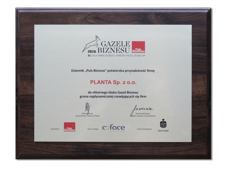 Ranking Gazele Biznesu to ranking najdynamiczniej rozwijających się małych i średnich firm z terenu całej Polski. Wśród nagrodzonych znalazła się także firma Planta. Gazela już po raz siódmy trafiła w nasze ręce i dumnie zawiśnie w reprezentacyjnym miejscu w naszej siedzibie. Dokładając starań do ciągłego rozwoju naszego biznesu, mamy nadzieję, że za rok to prestiżowe wyróżnienie znowu trafi w nasze ręce. Serdecznie dziękujemy kapitule konkursu i jego organizatorom.