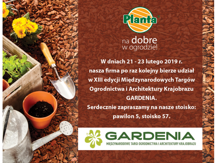 Już 21 lutego 2019r rusza XIII edycja Międzynarodowych Targów Ogrodnictwa i Architektury Krajobrazu GARDRNIA w Poznaniu. Wśród wielu firm z branży ogrodniczej będzie tam obecna również firma Planta. Zapraszamy do pawilonu nr 5 na stoisko nr 57, gdzie przedstawiciele firmy zaprezentują nowości z oferty na 2019r. Gwarantujemy fachową poradę i miłą atmosferę.
