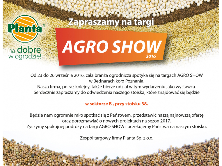 W dniach 23 - 26 września 2016 roku odbędzie się w Bednarach koło Poznania największa w Europie plenerowa wystawa rolnicza. Jest to miejsce gdzie prezentowane są najnowocześniejsze maszyny rolnicze oraz kompletna oferta dotycząca produktów i usług dla rolnictwa. Serdecznie zapraszamy na stoisko naszej firmy.