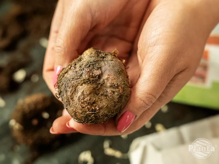 Po wyjęciu z opakowania, sprawdzamy, czy bulwa jest zdrowa. Nie może być mokra, miękka, z nadgniciami, ani zbyt sucha. Takich bulw należy się od razu pozbyć i umyć ręce, aby nie przenieść zgnilizny na inne bulwy.