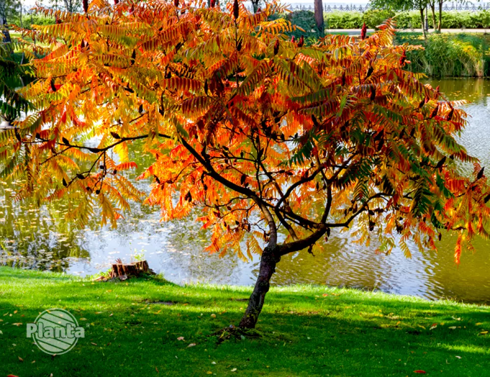 Sumak octowiec (Rhus Typhina), w zależności od prowadzenia może być krzewem lub drzewem. Jego złożone liście na grubych pędach pokrytych kutnerem, mogą osiągać długość nawet 50 cm, a wybarwione jesienią najpierw na intensywny żółty, potem czerwony kolor z daleka przyciągają wzrok. Drugim elementem przyciągającym uwagę są czerwono-bordowe owocostany, utrzymujące się na roślinie niemal przez cały rok. Jest rośliną dwupienną i dopóki nie pojawią się kwiatostany męskie lub owocostany trudno jest je rozróżnić.
