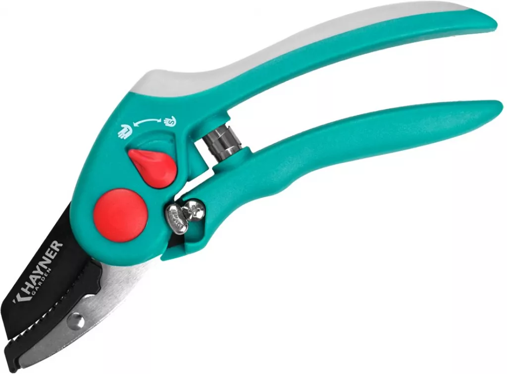 Sekator ręczny kowadełkowy Khayner Garden 448JD z możliwością wyboru stopnia rozwarcia: dla dużej dłoni / dla małej dłoni.